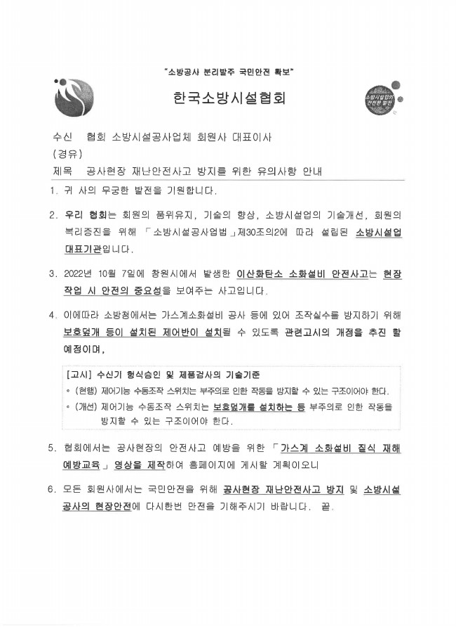 공사현장 재난안전사고 방지를 위한 유의사항 - 한국소방시설협회